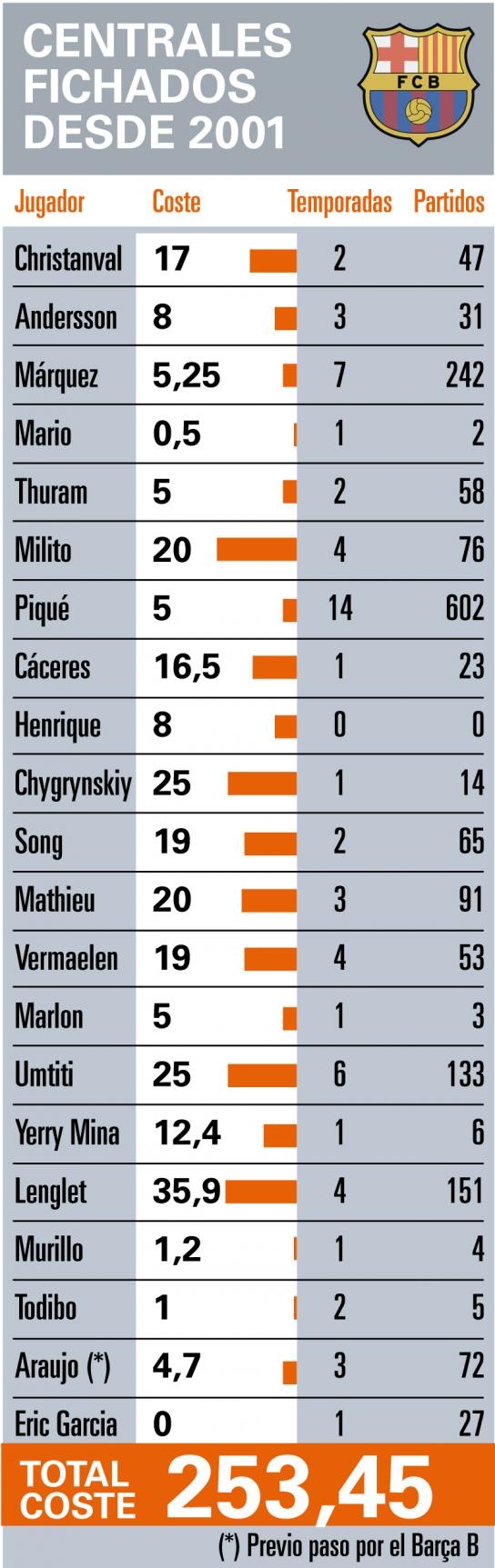 巴萨签下的21名中卫是:克里斯蒂瓦尔(1700万欧元)、安德森(800万欧元)、马克斯(525万欧元)、马里奥(50万欧元)、图拉姆(500万欧元)、小米利托(2000万欧元)、皮克(500万欧元)、卡塞雷斯(1650万欧元)、恩里克(800万欧元)、奇格林斯基(2500万欧元)、宋(1900万欧元)、马蒂厄(2000万欧元)、维尔马伦(1900万欧元)、马龙(500万欧元)、乌姆蒂蒂(2500万欧元)、米纳(1240万欧元)、朗格莱(3590万欧元)、穆里略(120万欧元)、托迪博(100万欧元)、阿劳霍(470万欧元)和加西亚(免签)。